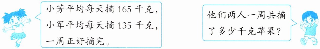 小芳平均每天摘$165$千克,小军平均每天摘$135$千克,那么两人一天共摘$m=(165 + 135)$千克。