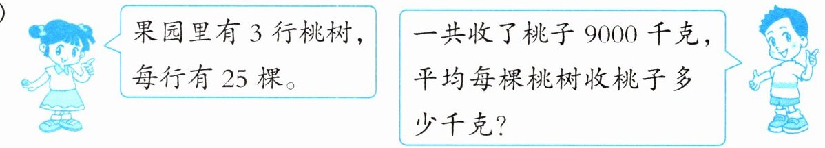 一共收了桃子$9000$千克,设平均每棵桃树收桃子$x$千克,根据“总重量$÷$总棵数$=$单棵重量”,则$x=\frac{9000}{3×25}$。