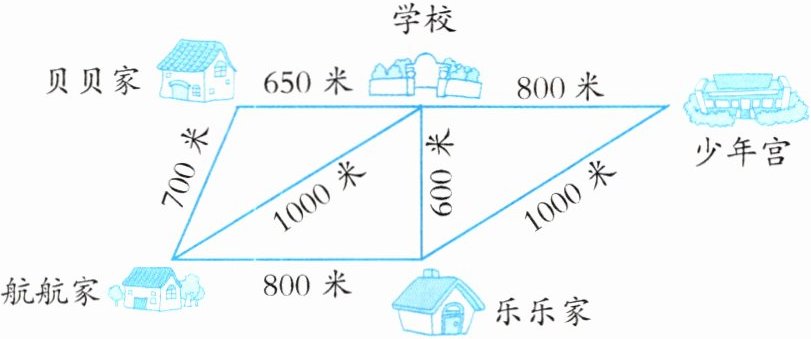 (2)乐乐家、航航家、学校和少年宫围成的四边形中,航航家到学校的距离是650米,乐乐家到少年宫的距离是1000米,航航家到乐乐家的距离是800米,学校到少年宫的距离是800米,两组对边分别相等,所以这个四边形是平行四边形。