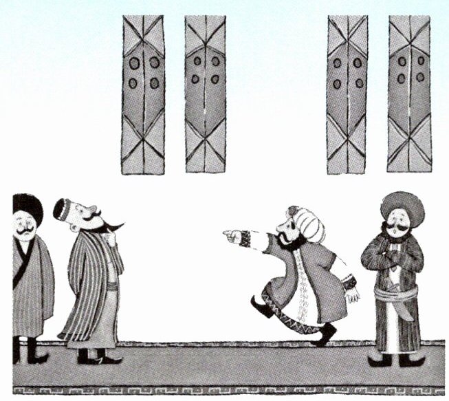 到了审案的那天,国王坐在殿上,专等阿凡提来,想要重重地惩罚他。等呀,等呀,等到下午才见阿凡提手里拿着一把铁勺来到殿上。