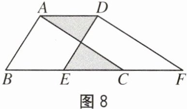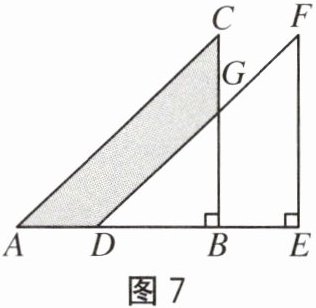 8. 如图7,在三角形ABC中,∠ABC= 90°,将三角形ABC沿AB方向平移AD的长度得到三角形DEF。已知EF= 8,BE= 4,CG= 3,则图中涂色部分的面积是()。