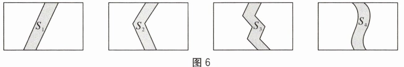 7. 有一块长为a m,宽为b m的长方形草地,计划在里面修一条小路,共有四种方案如图6所示,图中每一条小路的右边线都是由左边线向右平移1m得到的。四条小路的面积从左至右依次用$S_1,S_2,S_3,S_4$表示,则关于四条小路面积大小的说法正确的是()。