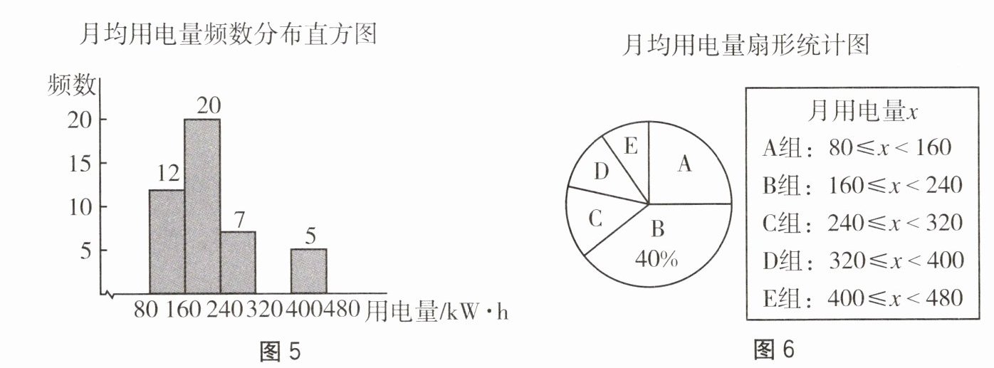 3. 为了制定更加合理的用电管理方案,某市对居民生活用电情况进行了调查,如图 5 和图 6 分别是通过抽样调查获得的若干户家庭去年的月均用电量 x(单位:$kW\cdot h$)的频数分布直方图(数据包括左端点不包括右端点)和扇形统计图.