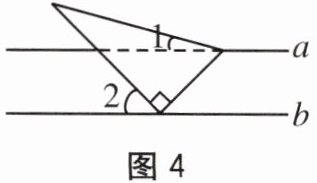 4. 如图 4,直线 $ a // b $,将含有 $ 30^{\circ} $ 角的直角三角尺按如图 4 所示的位置放置,若 $ \angle 1 = 15^{\circ} $,那么 $ \angle 2 $ 的大小为()。