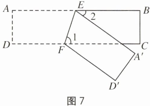 7. 如图 7,$ ABCD $ 为一长方形纸带,$ AB // CD $,将纸带沿 $ EF $ 折叠,$ A $,$ D $ 两点分别与点 $ A' $,$ D' $ 对应。若 $ \angle 1 = 2 \angle 2 $,则 $ \angle AEF $ 的度数为()。