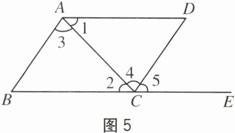 5. 如图 5,给出下列条件:① $ \angle B + \angle BCD = 180^{\circ} $;② $ \angle 1 = \angle 2 $;③ $ \angle 3 = \angle 4 $;④ $ \angle B = \angle 5 $;⑤ $ \angle B = \angle D $。其中,一定能判定 $ AB // CD $ 的条件有____(填写所有正确的序号)。