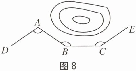 8. 如图 8,一条公路修到湖边时,需要拐弯绕湖而过,第一次拐的角 $ \angle A = 110^{\circ} $,第二次拐的角 $ \angle B = 145^{\circ} $,则第三次拐的角 $ \angle C = $____时,道路 $ CE $ 才能恰好与 $ AD $ 平行。