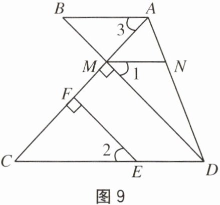 9. 如图 9,$ EF \perp AC $ 于点 $ F $,$ DB \perp AC $ 于点 $ M $,$ \angle 1 = \angle 2 $,$ \angle 3 = \angle C $。