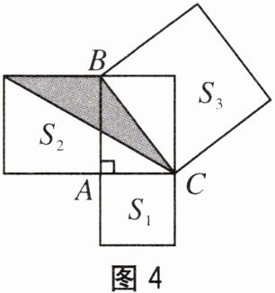 5. 如图4,在Rt△ABC中,分别以这个三角形的AC,AB,BC三边为边长向外侧作正方形,面积分别记为$S_{1}$,$S_{2}$,$S_{3}$. 若$S_{3}+S_{2}-S_{1}=18$,则图中阴影部分的面积为(