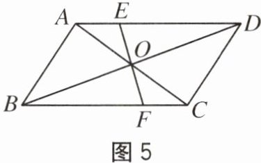 7. 如图5,$□ ABCD$的对角线相交于点$O$,过点$O$任引直线交$AD$于点$E$,交$BC$于点$F$,则$OE$