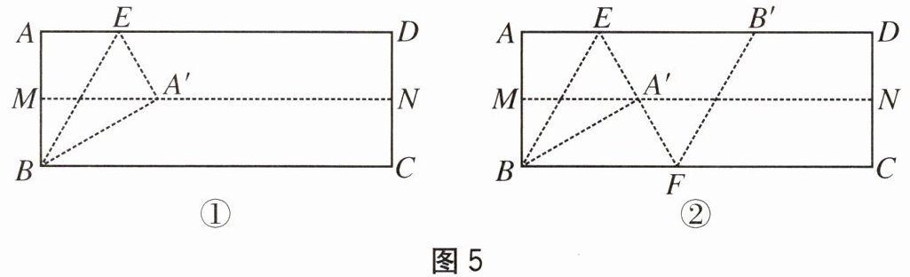第二步:再一次折叠,使点$A$落在$MN$上的点$A'$处,并使折痕经过点$B$,得到折痕$BE$,同时,得到线段$BA'$,$EA'$,展开,如图5①.