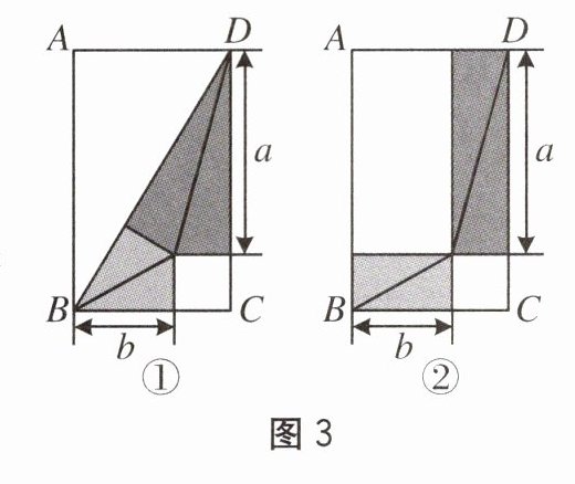 6. 利用图形的分、和、移、补探索图形关系,是解决数学问题的一种重要方法. 如图3①,$BD$是矩形$ABCD$的对角线,将$\triangle BCD$分割成两对全等的直角三角形和一个正方形,然后按图3②重新摆放,观察两图,若$a = 4$,$b = 2$,则矩形$ABCD$的面积是