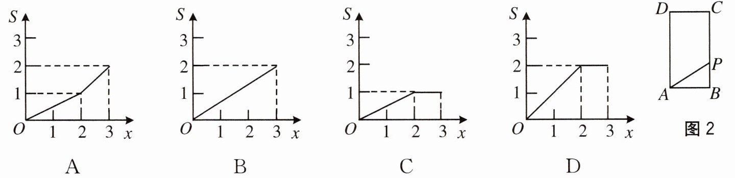 3. 如图 2,在矩形 $ ABCD $ 中,$ AB = 1 $,$ BC = 2 $,点 $ P $ 从点 $ B $ 出发,沿 $ B \to C \to D $ 向终点 $ D $ 匀速运动,设点 $ P $ 走过的路程为 $ x $,$ \triangle ABP $ 的面积为 $ S $,能正确反映 $ S $ 与 $ x $ 之间函数关系的图象是(
