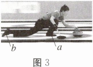 5. (多选题)冰壶运动鞋左右鞋底的材质不同,分别是塑料材质和橡胶材质,这是为了保证运动员在投掷冰壶时既能蹬冰发力又方便滑行。在运动员滑行时,橡胶材质的鞋底比塑料材质的鞋底受到的摩擦力大。如图3所示,运动员用b脚蹬冰面后,只用a脚向右滑行,下列说法正确的是( )。