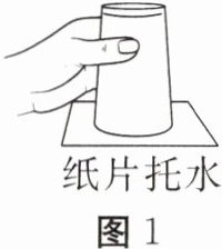 2. 在玻璃杯中盛满水,用一张纸片盖着,再倒过来,杯中的水不会流出来(如图1所示),这是因为( )。