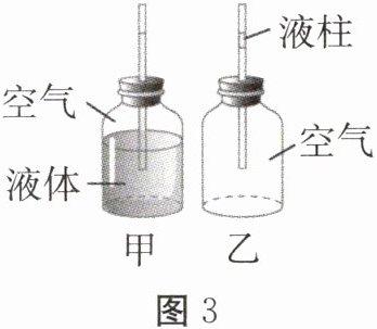 7. 如图3甲是某同学自制的一个简易气压计,在温度相同的情况下,大气压越大,甲中玻璃管内的液柱高度就越____(选填“高”或“低”);如图3乙是该同学自制的一个简易温度计,在大气压相同的情况下,温度升高,乙中玻璃管内的液柱____(选填“升高”或“降低”)。