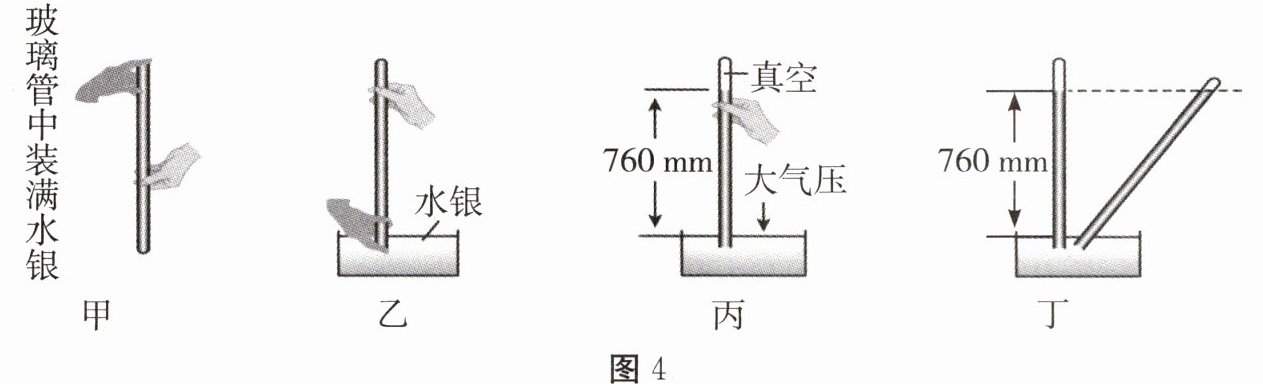 如图4,将长约1m、一端封闭的玻璃管灌满水银,用手指(戴手套)将管口堵住,然后倒插在水银槽中。放开手指,管内水银面下降到一定高度就不再下降,这时管内外水银面高度差约760mm。
