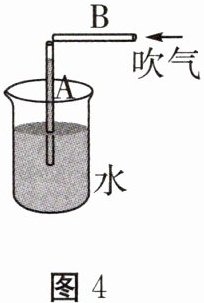 (2)如图4所示,把一根塑料管A竖直插入烧杯的水中,并使上端管口离水面3cm左右;把另一根塑料管B的管口贴靠在A管的上端。