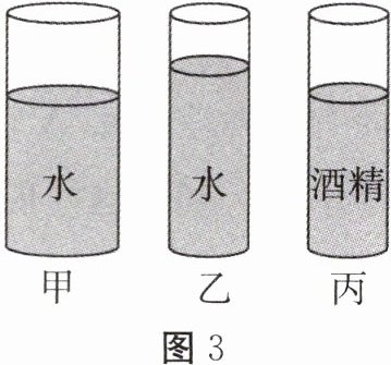 5. 如图3所示,甲、乙、丙是三个圆柱形容器,分别装有水或酒精($\rho_{酒精}<\rho_{水}$),甲、丙两容器中液体深度相同,乙、丙两容器的底面积相同。三个容器底部所受的液体压强分别为$p_{甲}$、$p_{乙}$、$p_{丙}$,则下列判断正确的是( )。