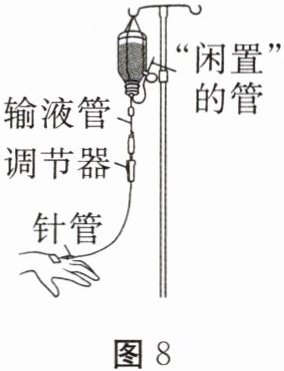 11. 护士给病人输液时,药水瓶上插着两根管,一根给病人输液,另一根通过瓶盖扎进瓶内药水中,如图8所示。这根“闲置”管是为了__________(选填“利用”或“不利用”)大气压强。由于针头较细,为确保药液的流速,需要将药水瓶提升到相对针管一般不低于1.3m的高度,由此推算针管处受到的液体压强为__________Pa。(g取10N/kg,$\rho_{药}=\rho_{水}$)