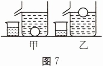 9. (多选题)在相同的溢水杯中分别盛满不同的液体,再放入两个完全相同的小球,如图 7 所示,当小球静止时,甲、乙两杯中溢出液体的重力分别是 0.4 N 和 0.5 N,$ g $ 取 10 N/kg,则下列说法正确的是( )。