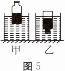 7. 一个薄壁密封饮料瓶内装有一些饮料,分别放在装有甲、乙两种液体的容器中,静止后饮料瓶的状态如图 5 所示。饮料瓶受到的浮力分别为 $ F_{甲} $、$ F_{乙} $。甲、乙两种液体的密度分别为 $ \rho_{甲} $、$ \rho_{乙} $,则( )。