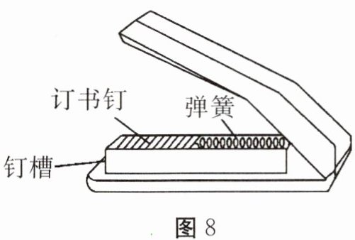 12. 如图8所示是一种常见的订书机,固定在槽内后部的弹簧给钉子一个向______(选填“左”或“右”)的弹力;在订书机正常使用过程中,随着槽内钉子数目的减少,该弹簧的弹力将______(选填“增大”“减小”或“不变”)。