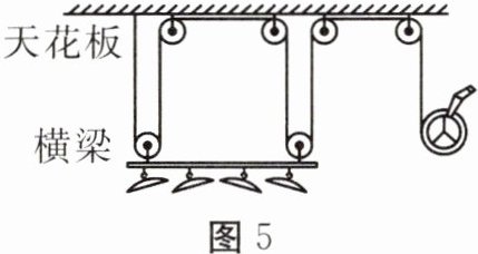 6. (多选题)如图5所示为一种手摇升降晾衣架示意图,绳子的尾端绕在一个固定在墙壁的旋轮上,旋转摇柄可以使晾衣架升降。假设在升降过程中衣架和杆保持水平,动滑轮、衣架与杆总重是10N,现晾衣架上晾有4kg的衣服,晾衣架上升50cm,用时10s。g取10N/kg,不计绳重和摩擦,则下列说法正确的是( )。