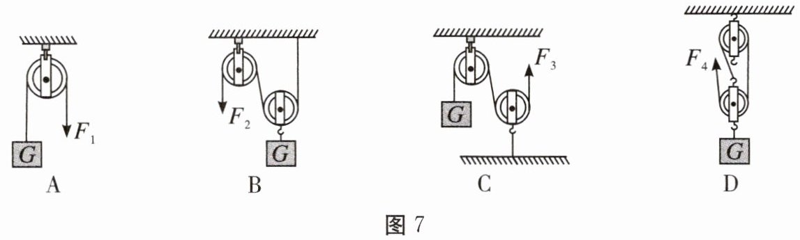 8. 如图7所示,分别用不同的滑轮组匀速提起重为900N的物体时,则$F_1=______N,$$F_2=______N,$$F_3=______N,$$F_4=______N。$(不计滑轮重、绳重和摩擦)