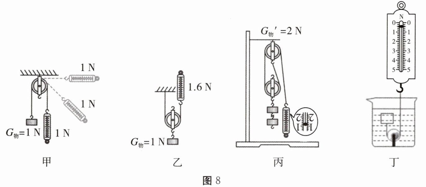 (2)如图8乙用动滑轮匀速竖直提升重物来研究动滑轮的特点,据此可知,使用动滑轮能省力,但却不是省一半力,原因可能是______。