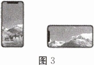 4. (多选题)现在的智能手机内部有一个重力感应器,将竖着放在水平桌面上的手机转过$90^{\circ}$变为横放,手机显示画面就会自动旋转$90^{\circ}$,保持画面正立,如图3所示。在把手机从竖放转为横放的过程中,该手机的( )。