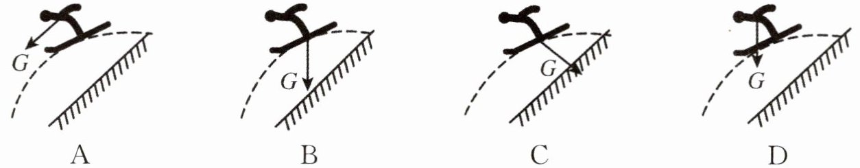 3. 跳台滑雪通常分为四个阶段:助滑、起跳、空中飞行和着陆。下列是运动员在空中飞行时所受重力示意图,其中正确的是( )。