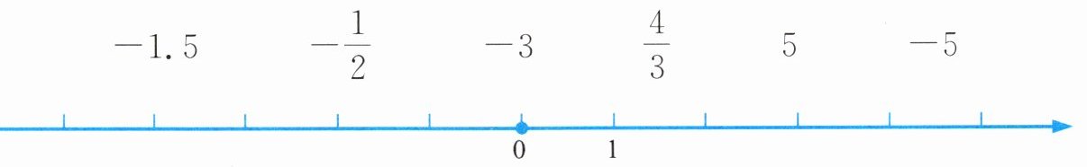综上,按照各数的正负和绝对值在数轴上找到对应位置并标记$\boldsymbol{-1.5}$、$\boldsymbol{-\frac{1}{2}}$、$\boldsymbol{-3}$、$\boldsymbol{\frac{4}{3}}$、$\boldsymbol{5}$、$\boldsymbol{-5}$。