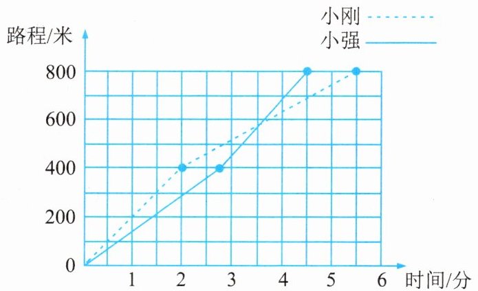 (2) 看小刚的折线,前面上升快(速度快),后面上升慢(速度慢);小强的折线前面上升慢(速度慢),后面上升快(速度快)。