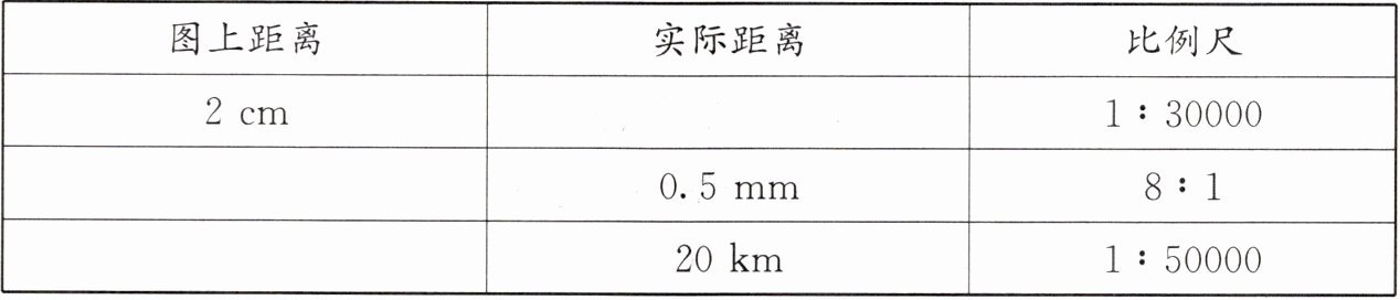 1. 对于第一行,根据“实际距离$=$图上距离$÷$比例尺”,已知图上距离$2cm$,比例尺$1:30000$,则实际距离为$2÷\frac{1}{30000}=2×30000 = 60000cm$,因为$1m = 100cm$,$1km=1000m$,所以$60000cm = 600m=0.6km$。
