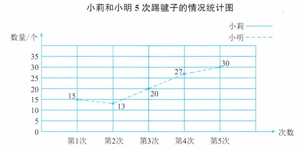 (1)观察统计图,小莉第$2$次踢$13$个,小明第$2$次也踢$13$个;小莉第$5$次踢$30$个,小明第$5$次也踢$30$个。所以第$2$次和第$5$次他们踢毽子的个数相等。
