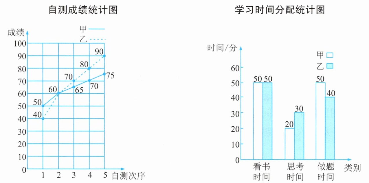 5. 下面两个统计图反映了某校六年级甲、乙两位同学在复习阶段的自测成绩和在家学习时间的分配情况,看图回答以下问题。