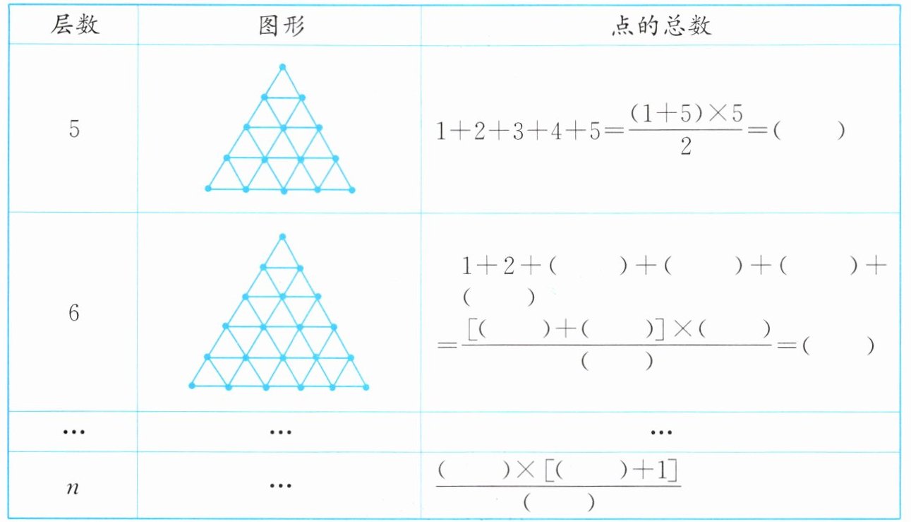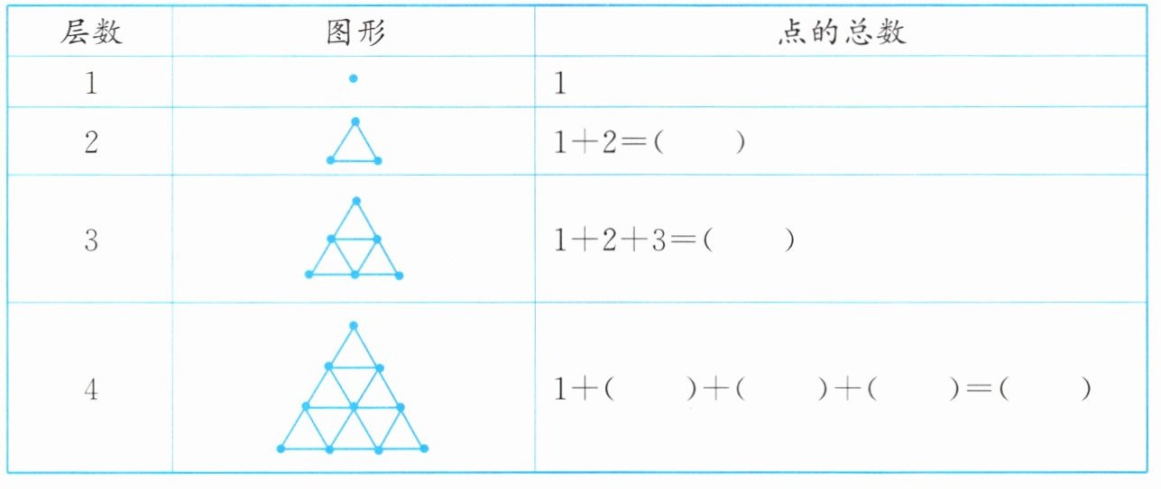1. 有趣的三角形数。如图,从顶点起依次为第1层、第2层……仔细研究下一层与上一层点数的关系,你能发现哪些规律?
