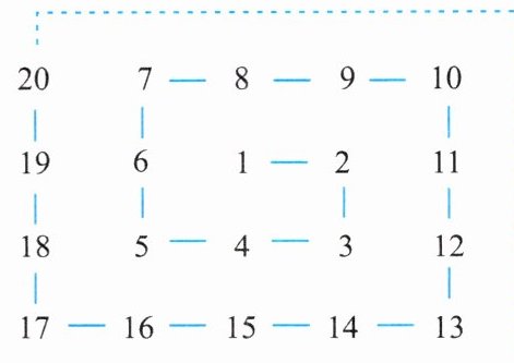 9. 如图,将自然数按从小到大的顺序排列成螺旋形,在2处拐第1个弯,在3处拐第2个弯,在5处拐第3个弯……拐第20个弯的地方是哪个数?
