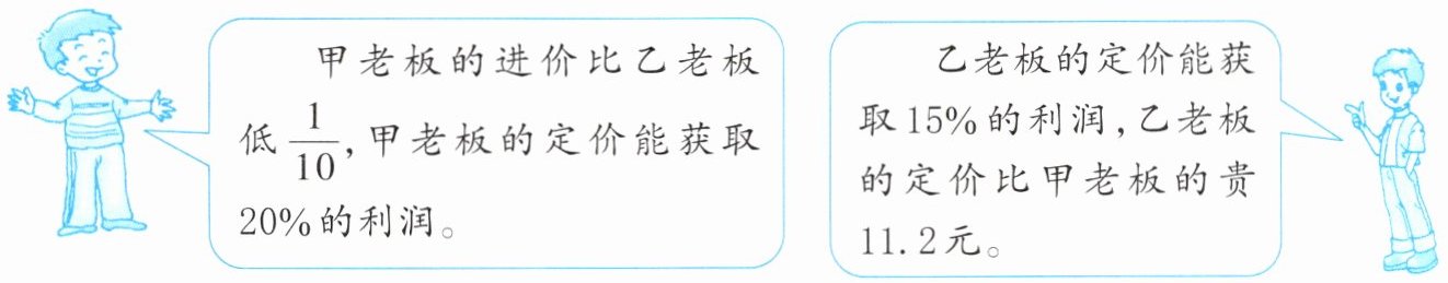 (5) 乙老板的进价: $ 11.2 ÷ \left[ ( 1 + 15 \% ) - \left( 1 - \frac { 1 } { 10 } \right) × ( 1 + 20 \% ) \right] = 160 $(元) 甲老板的进价: $ 160 × \left( 1 - \frac { 1 } { 10 } \right) = 144 $(元)