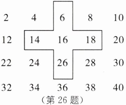 (1) 十字框中的五个数的和为$6 + 14 + 16 + 18 + 26 = 80 = 16×5$,即是$16$的$5$倍。