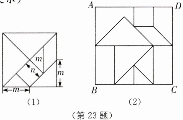 23. 传统文化 七巧板 七巧板(如图(1))是中国古代人民发明的一种传统智力玩具,它由五块等腰直角三角形、一块正方形和一块平行四边形共七块板组成(已知线段长度如图所示). 现将它拼成一个“房子”造型(如图(2)),恰好放入长方形$ABCD$容器中,求长方形容器的周长. (用含$m,n$的代数式表示)