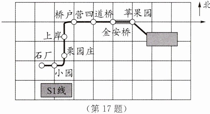 17. 如图是北京S1号线地铁的分布示意图,其中桥户营、四道桥、金安桥、苹果园四站在同一条直线上。如果在图中以正东为正方向建立数轴,桥户营站、苹果园站表示的数分别是-4,2,那么金安桥站表示的数是______