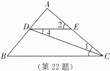 22. 如图,$DE// BC,∠2是∠1$的2倍,且$∠B与∠ACB$互余,若$∠B= 50^{\circ }$,求$∠4$的度数.