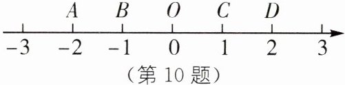 10. 如图,数轴上的点A,B,O,C,D分别表示数$-2,-1,0,1,2$,则表示数$2-\sqrt{5}$的点P应落在(