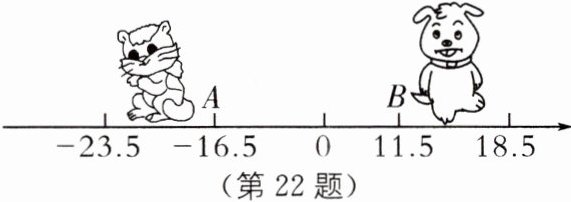 22. 如图,小怡在一张纸上画了一条数轴。妹妹不知道它有什么用,就在上面画了一只小猫和一只小狗,于是数轴上标的数字有的看不到了。请你根据图中信息回答下列问题: