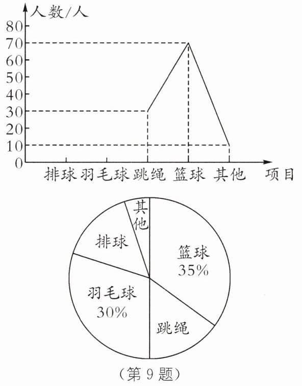 9. 某中学对学生最喜欢的课外体育项目进行了随机抽样调查,要求每人只能选择其中一项,根据得到的数据,绘制的不完整统计如图所示,则下列说法中正确的是(