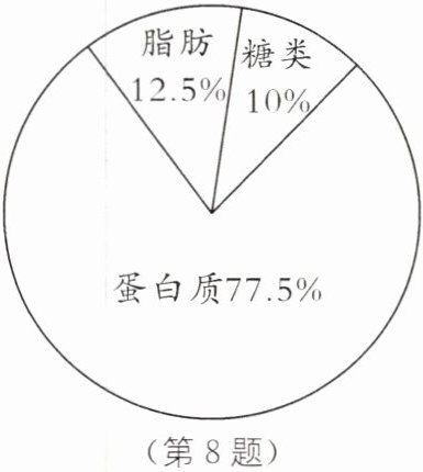 8. 我们知道,食物中含有糖类、脂肪、蛋白质、水、无机盐和维生素六类营养物质,其中糖类、脂肪和蛋白质属于食物中的供能物质,水、无机盐和维生素是食物中的非供能物质,某种食物A中的供能物质约占食物总质量的80%,如图所示的扇形统计图表示了食物A中的三种供能物质的分布情况,则100克食物A中蛋白质约占的克数是(