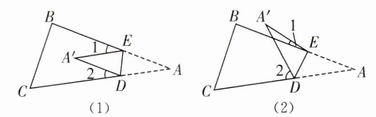 (3)如果 $ A' $ 落在四边形 $ BCDE $ 的外部(如图(2)),这时 $ \angle A' $ 与 $ \angle 1 $,$ \angle 2 $ 之间又存在怎样的数量关系? 并说明理由。