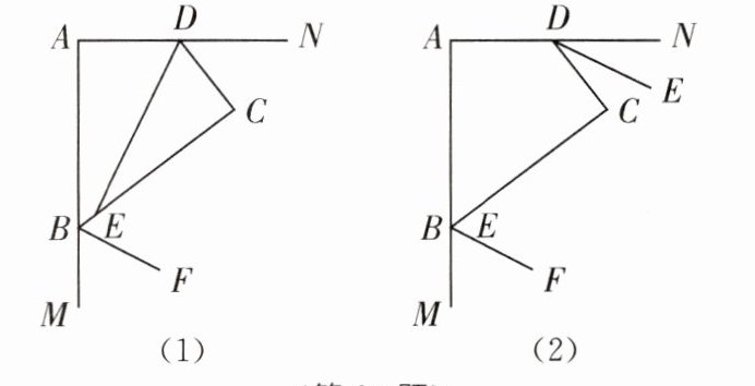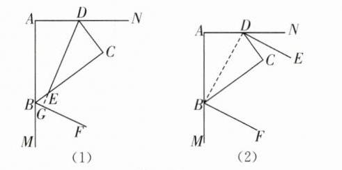 (3)如图(2),若 $ BF $,$ DE $ 分别平分 $ \angle ABC $,$ \angle ADC $ 的外角,写出 $ BF $ 与 $ DE $ 的位置关系,并证明。